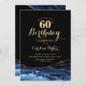 Marinho azul, preto e dourado agate 60º convite de aniversário. Elegante design moderno com cor azul-real de água agate marble geode fundo, fonte falsa de ouro brilhante e script de tipografia. Trendy convida o cartão perfeito para uma comemoração de dia das mulheres na moda. Impressos convites Zazzle ou modelo de impressão digital instantânea para download.