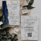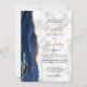 A borda esquerda deste elegante convite de casamento moderno apresenta um marinho azul de aquarela agata borda aparada com falso brilho dourado. O texto personalizável combina manuscrito dourado com fontes em preto e em itálico em fundo branco e cinza. O verso fornece espaço para detalhes do casamento em um fundo de mármore, junto com um código QR que os convidados podem digitalizar para visitar seu site e RSVP, o que economiza o custo de imprimir e enviar cartões RSVP separados.