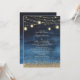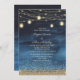 Convite de casamento azul moderno, elegante e marinho chic com brilho dourado, luzes de cordas e lanternas. O texto está em uma fonte de script elegante que é completamente personalizável com a ferramenta design fácil de usar do Zazzle. Entre em contato conosco para obter ajuda com a personalização ou para solicitar produtos adicionais correspondentes.