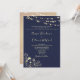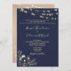 Elegante, moderno, rústico, chique, convite formal de casamento azul-marinho com um lugar floral dourado e luzes de cordas.