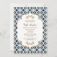 O elegante e belo francês marroquino inspirou convites de chá de panela com um marinho azul de safira e padrão geométrico de ouro design e flores florais de ouro abarrotados. Este convite em escala e luxo é perfeito para qualquer chá de panela formal, exótico, marroquino, árabe ou aladino. A parte de trás desses convites e anúncios personalizados de quadro de rico pode ser personalizada com o breve monograma e nome de evento da noiva na forma quatrefoil e design de aparência de fita impressa. Trabalho de arte e design © Chrissy H. Estúdios, LLC. Todos os direitos reservados.