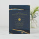 Design apresenta um elemento agate colorido impresso em tons de azul e ouro do marinho. Texturas azuis de canvas marinho e script de tipografia dourada ou escrevendo de tipos. Excelente para as comemorações do casamento!