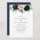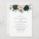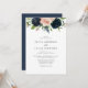 Convite de casamento com o tipo elegante e florais de cor d'água no topo e no fundo. As cores incluem marinho azul-da-meia-noite, rosa de pincel, branco e amplo verde.