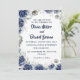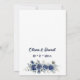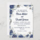 Este design de convite para o casamento apresenta uma elegante borda floral de rosas azuis escuros e delicados florescimentos, acentuados com detalhes de prata e ouro. Este arranjo envolve um centro branco elegante, perfeito para o texto. A combinação de cor azul-escura prateada e dourada e folhas delicadas cria um toque eterno, sofisticado. Um arranjo floral correspondente é adicionado ao verso do carregar sobre o tema geral.