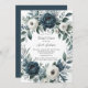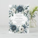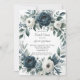 Um casamento sofisticado com um marinho azul-d'água, coroa corada floral, enfeitado com peonias, rosas e verde eucalipto em tons de azul marinho, verde e marfim. A design é aprimorada por uma caixa de cinza prateada, impressa abaixo da coroa, com layout de texto de fonte moderno. O verso do convite continua o tema com arranjo floral correspondente para um olhar coeso e elegante. Perfeito para casais que buscam eterno e papelaria de casamento clássico.