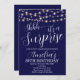 Marinho Azul e String Light Surprise Birthday Invitation. Este design apresenta bonito, pintado, Marinho Azul e String Light Surprise Birthday. Clique no botão personalizar para obter mais flexibilidade na modificação do texto ou na movimentação dos gráficos. Entre em contato conosco se você precisar deste design aplicado a um produto específico para criar seu próprio item de correspondência exclusivo.