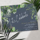 Convites de festas de aniversários casuais com plantas tropicais de aquarelas sobre fundo azul escuro. Texto "Comemoração de Vamos" em uma fonte de script com os detalhes do evento no canto inferior direito. Pode ser mudado para qualquer idade.