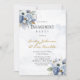 Design apresenta um elemento floral impresso em tons de azul empoeirado e ouro sobre folhas verdes e floradas de pedras e rosa. Excelente para as comemorações do casamento!