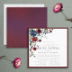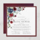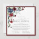 Chá de panela virtual quadrado moderno, elegante, com um buquê de flores azuis e burro-marinho e verde botânico, bordado num rico vermelho-burguês. Personalize os detalhes do seu chá de panela em preto suave, acentuado com uma bela caligrafia manual moderna. A parte traseira da placa apresenta uma textura vermelha abstrato burgundy. Copyright Elegant Invites, todos os direitos reservados.