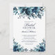 Moderno e moderno, este design chá de panela apresenta florais de rosa de aquarela em tons de azul marinho, com uma textura poeirenta de cor azul de marinho no reverso. Copyright Elegant Invites, todos os direitos reservados.