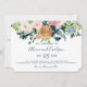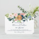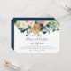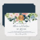 buquês cor-de-rosa-claro, creme de marfim e rosas de pénia azul-marinho com folhagem verde e um círculo de ouro metálico arredondado de cobre fazer de um convite para casamento horizontal de glama moderno com um desenho de tipografia manuscrito e completamente editável. +++++++++++++ Fácil de personalizar com seus detalhes! Adequado para todas as estações, tema do jardim, celebrações e recepções - primavera, verão, outono ou inverno.
