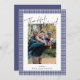 Celebre o Dia de Ação de Graças com este elegante cartão com fotos que apresenta uma marinho fronteira azul de gingham e a mensagem sincera "Graças e abençoado." Personalize facilmente com sua própria foto e nome da família para criar uma manutenção quente e eterno para a temporada de festas. A parte traseira do cartão inclui desejos de Ação de Graças prontos para uso, que você pode manter como está ou substituir pelo seu próprio texto personalizado.