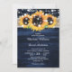 Convite de casamento russo azul e girassol marinho com girassóis em uma toca e corredor contra um fundo de madeira rústica adornado com luzes de cordas. Dois corações de burlap nas costas. Design de cartão perfeito para sua festa de casamento azul-marinho, inspirada pelas flores de girassol.