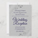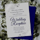 Este simples convite foi feito para convidados para a recepção, mas não para a cerimônia de casamento propriamente dita. Ele apresenta um design na moda elegante e elegante com a inscrição de um script azul de marinho rico no fundo de uma cinza e ornamentados de folha fina de cinza prateada e espirais nos cantos. Uma bela maneira de convidar seus amigos e família para comemorar com você!