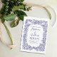 Uma borda bonito dá um toque romântico a um tema simples de cor azul e branca marinho. A mão traçada é cheia de flores rosa selvagens, folhas, borboletas, ramos entrelaçados e fitas e duas pequenas aves. O fundo de ambos os lados é branco nítido. Simples, clássico, tradicional e romântico! Trabalho de arte e design únicos de Tuzi Williams.