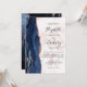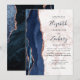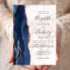 A borda esquerda deste elegante convite de casamento moderno apresenta um marinho azul de aquarela agate bordado com falso brilho rosa de ouro. O texto personalizável combina um script de escrita manual azul escuro com fontes em preto e em itálico em um fundo de mármore branco e rosa dourado. O verso apresenta um design marinho de agate azul e rosa dourado correspondente.