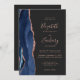 A borda esquerda deste elegante convite de casamento moderno apresenta um marinho azul de aquarela agate bordado com falso brilho rosa de ouro. O texto personalizável combina letras rosa douradas, letras em copperplate e fontes itálicas em um fundo preto de ardósia. O verso fornece espaço para detalhes do casamento em um fundo de slate sólido, junto com um código QR que os convidados podem digitalizar para visitar seu site e RSVP, o que economiza o custo de imprimir e enviar cartões RSVP separados.