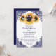 Convites de chá de panela de girassol azul-marinho personalizados com flores de girassol, luzes de cordas e rendas florais. Itens correspondentes disponíveis para complementar esses convites de chá de panela chic marinho azul elegantes.