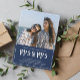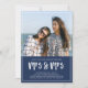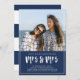 Um convite de casamento fotográfico para um casamento lésbico com uma foto das noivas para ser e mrs e mrs escritas em uma fonte grande contra um fundo azul marinho.