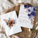 Este marinho azul, terracota, e belo convite de casamento floral elegante traz uma mistura perfeita de estilo e encanto para o seu dia especial. Apresentando uma bela mistura de tons azuis, ferrugem, terraços, azuis empoeirados e prateados, este design destaca as flores aquarelas e o roteiro de caligrafia chica para um aspecto moderno, mas eterno. Ideal para casamentos de outono, rústicos ou com temas bóticos, este convite combina com celebrações de outono e festas de na moda. Personalizar os detalhes é fácil, para que você possa personalizar tudo para ajustado perfeitamente sua visão. Além disso, você pode enviá-lo digitalmente para uma opção rápida e sem estresse. Peça seus cartões de casamento hoje e impressione seus convidados desde o início!