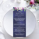 Um fundo azul marinho, a cor azul é irregular. Decorado com flores cor-de-rosa, violeta, púrpura e aquosa. Modelos para seus nomes e o menu de casamento.