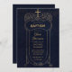Esse elegante convite batismo com ar vintage, recomendado para batizar menino, tem uma moldura decorativa com parte superior ornamentada que tem forma parecida com asas de anjo, com decorações em espiral representando folhas estilizadas dentro e com cruz de ouro sobre ela, e mais simples na parte inferior, terminando em pequenas espirais e dois pequenos galhos com folhas sob o texto. O fundo é marinho azul. O nome do garoto está escrito em um roteiro caligráfico elegante. Todo texto pode ser personalizado e tem uma cor de ouro semelhante à cruz dourada. O quadro de colheita é de um antigo cobrir do livro "A Imagem das Cinzas Dorianas" de Oscar Wilde, publicado em Londres em 1913, agora no dominio público.