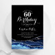 Marinho azul, preto e prateado agate 60º convite de aniversário. Elegante design moderno com cor azul-real de água agate marble geode fundo, faux glitter prata e script de tipografia. Trendy convida o cartão perfeito para uma comemoração de dia das mulheres na moda. Impressos convites Zazzle ou modelo de impressão digital instantânea para download.