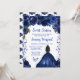 Este elegante e glamouroso e doce convite de 16 anos apresenta uma bela princesa com cabelo castanho e pele escura em um vestido azul marinho de bola. O texto combina o script manuscrito e as fontes sans serif modernas para um aspecto elegante e sofisticado. Os arranjos florais, borboleta e confete criam a mistura perfeita de rústico e chic. Gráficos por www.etsy.com/uk/shop/SunflowerDayLove