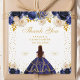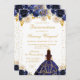 Este elegante e glamouroso convite de aniversário da Quinceañera apresenta uma bela princesa com cabelo escuro num vestido de tiara e marinho de bola azul. O texto combina o script manuscrito e as fontes sans serif modernas para um aspecto elegante e sofisticado. Os arranjos florais e o confete de ouro criam a mistura perfeita de rústicos e quicos. Gráficos por www.etsy.com/uk/shop/SunflowerDayLove