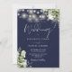 Este elegante convite de casamento azul-marinho apresenta bonito luzes de cordas e verde floral e pode ser personalizado com suas informações em tipografia gráfica com suas iniciais de monograma no verso. Projetado por Thisnotme©