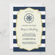 Este convite de aniversário gráfico, náutico, apresenta riscas azuis e brancas, marinho em negrito, borda falsa em folha de ouro, caligrafia bonito e roda do navio. Altere o texto para se adequar a qualquer ano de aniversário.