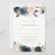 Este convite de casamento para a nuestra de ouro floral de marinho é perfeito para um casamento rústico. O design apresenta belas flores azuis escuras, azuis, marinhos, rosa, pinceladas, douradas e folhagem verde pintadas manualmente, amontoadas em buquês elegantes.