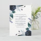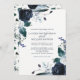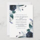 Este convite de casamento elegante e tenebroso apresenta flores de marinho azul-aquarela com folhas, bagas e penas peludas sobre fundo branco.