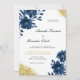 Um layout de casamento refinado com flores de cor d'água de marinho profundo, emparelhado com sotaques de poeira de ouro macio em um fundo branco limpo. Um design perfeito para cerimônias elegantes e românticas com um toque de brilho.