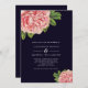 Um convite de casamento clássico e eterno em azul marinho e rosa. Duas minuciosas pénicas cor-de-água cor-de-rosa decoram os cantos deste convite, num sofisticado fundo azul-marinho, que é o mesmo que o backer. Seu texto de convite está em branco contrastante. .