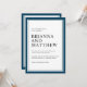 Simples e saboroso, este clássico design de convite de casamento moderno tem uma dupla fronteira azul marinho com um fundo central branco. Os quadros de texto são nítidos e elegantes, com ênfase nos nomes da noiva e do noivo que aparecem em grande impressão. O esquema de cores é uma escolha maravilhosa para casamentos costeiros ou casamentos de destino, assim como outros locais escolhidos. O estilo clássico simples é sempre uma boa escolha em qualquer estação do ano.