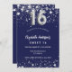 Um convite moderno, na moda e glamouroso para uma doce festa de aniversário 16, 16. Um fundo azul marinho, decorado com estrelas de falso prata. Personalize e adicione seu nome e detalhes da festa. O número 16 é escrito com uma fonte no estilo do balão.