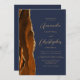 A borda esquerda deste elegante convite de casamento moderno apresenta uma cor de água laranja queimada, aparada com falsa brilho dourado. O texto personalizável combina o script dourado e as fontes sans serif em um fundo azul marinho. O verso oferece espaço para detalhes do casamento, juntamente com um código QR que os convidados podem digitalizar para visitar seu site e RSVP, o que economiza o custo de impressão e envio de cartões RSVP separados.