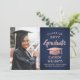 Anuncie um segundo grau ou formandos e convide a família e os amigos a celebrarem com convites de festas azuis e cor-de-rosa de marinho fotográfico personalizados. A imagem e o texto são simples de personalizar e as cores são fáceis de mudar com a ferramenta design Zazzle. Este modelo para download é configurado como um cartão de lançamento combinado e um convite de festas que pode ser personalizado com qualquer detalhe de sua escolha, como nomes de pais, honras especiais, título de grau, citação inspiracional favorita, planos futuros de formando ou novo endereço. O design apresenta um fundo azul-marinho, boné de conselho de morteiro de folha de rosa, caligrafia moderna elegante, tipografia de vintage clássica e uma foto favorita, como uma fotografia de mais velho ou uma imagem da cerimônia de início. Note que o ouro rosa é cor-de-rosa impressa, não é folha metálica. Este cartão de graduação imprimível é uma na moda para anunciar uma celebração especial de dia. Parabéns ao formando!