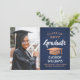 Anuncie um segundo grau ou formandos e convide a família e os amigos a celebrarem com convites de festas de cor azul e de cobre de marinho de fotos personalizadas. A imagem e o texto são simples de personalizar e as cores são fáceis de mudar com a ferramenta design Zazzle. Este modelo para download é configurado como um cartão de lançamento combinado e um convite de festas que pode ser personalizado com qualquer detalhe de sua escolha, como nomes de pais, honras especiais, título de grau, citação inspiracional favorita, planos futuros de formando ou novo endereço. O design apresenta um fundo azul-marinho, boné de conselho de morteiro de folha de cobre, caligrafia moderna elegante, tipografia de vintage clássica e uma foto favorita, como uma fotografia de mais velho ou uma imagem da cerimônia de início. Observe que cobre é cor laranja mudada, não é folha metálica. Este cartão de graduação imprimível é uma na moda para anunciar uma celebração especial de dia. Parabéns ao formando!