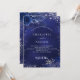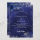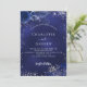 Um fundo azul marinho, decorado com falso brilho prateado, faíscas e flores azuis. A cor azul é irregular. Personalize e adicione seus nomes e detalhes. Adicione a url do site do casamento para detalhes do casamento e RSVP.