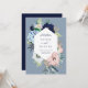 Este convite de casamento de na moda e trendy apresenta uma estrutura geométrica moderna com flores de cor d'água náutica. As flores de hidrangea, pénia e anêmona aparecem em tons de azul marinho, azul claro e rosa pincel com folhas bege verde e neutro. O fundo do cartão é uma cor azul empoeirada, e a parte de trás do cartão é marinho azul escuro.
