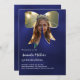 Um fundo azul-marinho, incolor, decorado com um quadro fotográfico em forma de arco. Personalize e adicione um nome e detalhes da parte.