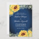 Estes convites para o casamento de girassol apresentam girassóis de cor d'água e o hálito do bebê sobre um fundo de madeira azul marinho. Personalize-os com o seu próprio texto.