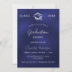 Um convite moderno e elegante para a festa de formatura. Um fundo azul marinho, texto branco. A cor azul é irregular. Personalize e adicione um nome, ano e detalhes.