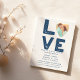 Estes simples convites para o casamento têm uma aparência moderna industrialista com um gráfico ousado que soletra a palavra AMOR em letras marinhos azuis em estilos angustiados com a sua fotografia num coração para o "O". Abaixo do gráfico, seus detalhes de casamento aparecem em uma fonte de estilo de máquina de escrever em azul-marinho de coordenação. O reverso destes convites para a tela plana é um marinho azul. Se você gosta de manter as coisas simples e não quer algo muito florescente, esses convites ao estilo minimalista são perfeitos para divulgar a notícia sobre seu próximo casamento.