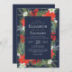 Esta design festiva apresenta um quadro de verde e flores de férias, incluindo poinsetos vermelhos e brancos, ramos de pínus verdes e roedores de eucalipto. O texto branco aparece em um retângulo azul marinho. Ideal para um casamento no inverno ou no Natal. A parte traseira da placa é azul marinho estável.