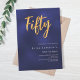 Um convite moderno e na moda para uma 50ª festa de aniversário para ele e para ela. A cor azul é irregular. Fundo azul marinho e a palavra 50 escrita com letras douradas falsas grandes. Personalize e adicione um nome e detalhes da parte. Texto branco.