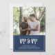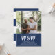 Um convite para casamento de fotos para um casamento de gay com uma foto dos noivos para ser e mr & mr escrito em uma fonte de pincel grande contra um fundo azul marinho.