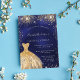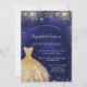 Uma tendência e um convite glamouroso para uma Quinceañera, 15 festa de aniversário. Um fundo azul marinho com poeira brilhante dourada falsa e um vestido. A cor azul é irregular. O nome é escrito com um moderno estilo escrito à mão. Personalize e adicione os detalhes da sua festa.